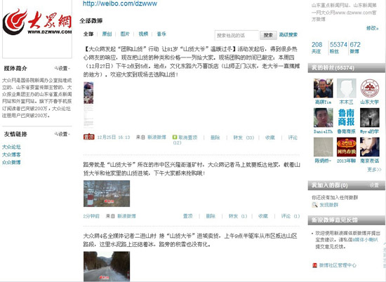 “團(tuán)購(gòu)山貨,團(tuán)一份愛(ài)心,讓老人溫暖過(guò)冬!”明天(27日)下午兩點(diǎn),大眾網(wǎng)將在濟(jì)南市文化東路六乃喜快餐店為“山貨大爺”楊洪義老人舉行團(tuán)購(gòu)活動(dòng)。明天一早,大眾網(wǎng)記者將趕往老人家中幫助拉山貨,大眾網(wǎng)新浪官方微博對(duì)活動(dòng)進(jìn)行全程直播,歡迎網(wǎng)友關(guān)注。