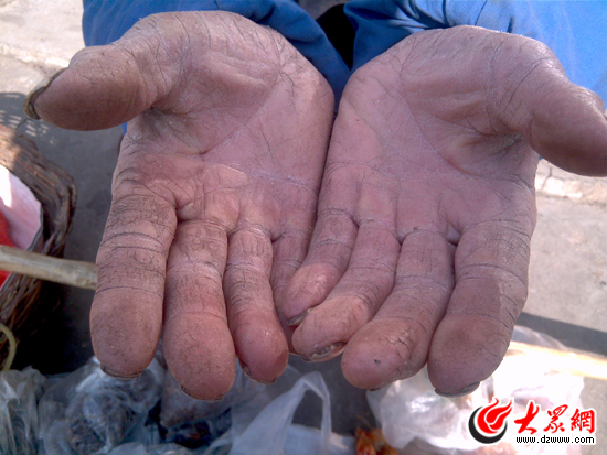 長期干活,老人的雙手皸裂嚴重。(韋輝 攝)