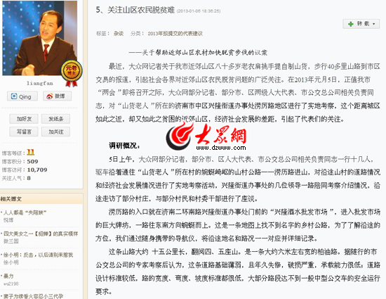 近日,大眾網關于“山貨大爺”的系列報道,引起社會各界對近郊山區農民脫貧問題的廣泛關注。對此,濟南市人大代表梁凡說,他剛剛完成《關于幫助近郊山區農村加快脫貧步伐的議案》,明天濟南市十五屆人大二次會議開幕后,將向大會提交,建議有關部門克服困難,幫助這個地區開通公交車,走上小康路。