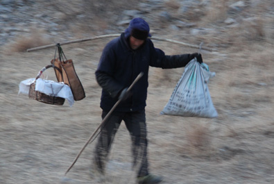 大嶺山不高,雖然山路并不陡峭,但是長長的山坡加上碎石遍布,挑著40斤擔(dān)子的楊洪義老人如履平地,老人說“路在心中”。