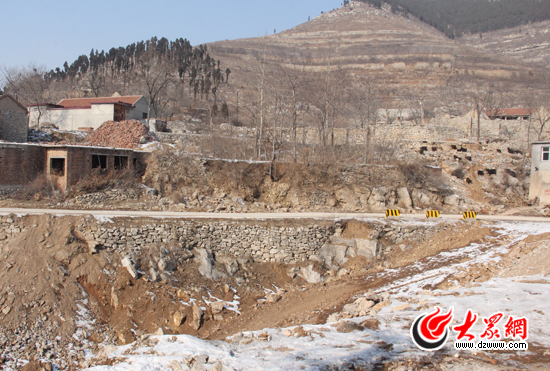 從礦村通往侯家村的山路中,有五個(gè)拐彎將實(shí)行路旁大坑填平施工。圖為其中一處彎路。
