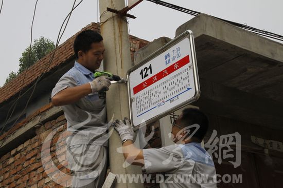 今天上午7點,濟南公交總公司的工作人員帶著121路公交的沿線站牌和工具來到了重汽技術中心站點,更換印有121路公交車發車時間、站點的公交站牌,而這里也是121路公交的始發站。