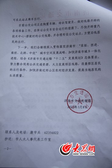 今天下午,大眾網記者見到了濟南市人大代表梁凡。他告訴記者,最近幾天,濟南市交通運輸局、市中區交通局、市中區農業局的有關負責人先后找到他,對他提交的“幫助近郊山區農村加快脫貧步伐”的建議進行了面復。