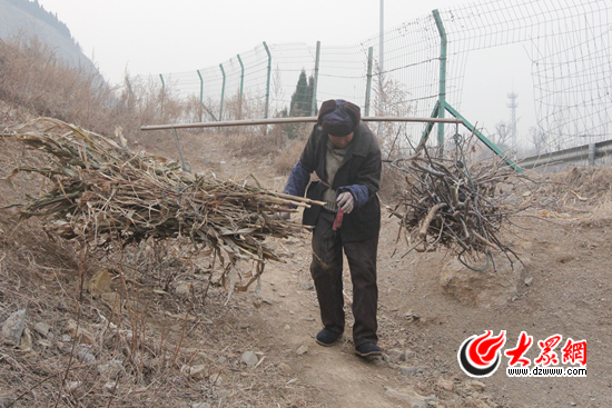 在劉大娘的指引下,大眾網(wǎng)記者沿著小路出村,步行大約1公里在礦村東面的一片小山上看到了正在砍柴的“山貨大爺”楊洪義。遠(yuǎn)遠(yuǎn)地,記者看到楊洪義手持鐮刀,把一些枯干的灌木樹枝砍倒,然后將樹枝和玉米秸稈等簡單分類歸攏到一起。雖然已經(jīng)年過80,但是楊洪義老人身體硬朗、手腳麻利,一人多高的地崖子他爬上爬下行動自如,不一會兒就拾了兩小堆柴火。