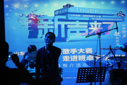盡管晚上天氣寒冷,但歌手、觀眾們熱情高漲。很多歌手提前幾個小時來到現(xiàn)場,一遍遍認真地反復練習自己的演出歌曲。89年的東北小伙徐江畔,是目前網(wǎng)絡人氣最高的歌手,他最初是從齊魯手機報上得知大賽信息并報名,目前在一家國企做銷售處經(jīng)理。剛來濟南打拼的他帶來張學友的《我真的受傷了》,得到了現(xiàn)場眾多觀眾的共鳴。