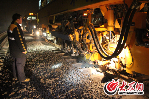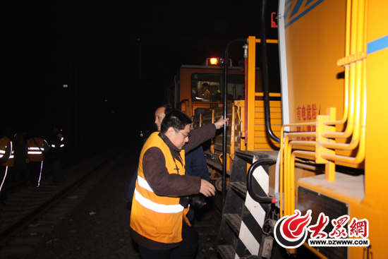 [提要] 1月13日晚上8點28分,淄博市臨淄火車站前,漆黑、安靜。大眾網記者跟隨濟南鐵路局工務機械段的20多名維修工走上月臺。此時,鐵軌上,一組50多米長的維修機車正靜臥在膠濟鐵路客運專線上,等待我們的到來。