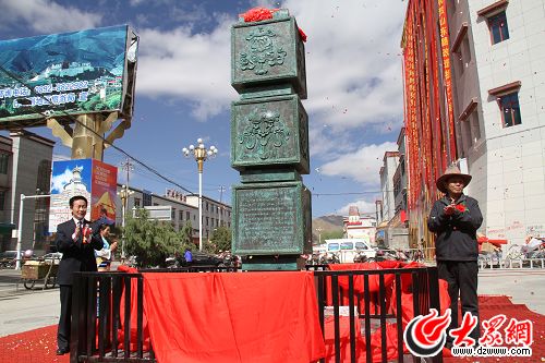 日喀則地委書記丹增朗杰(右)和山東援藏干部領隊、日喀則地委副書記張寧波共同為山東路文化新地標“吉祥八寶”青銅雕塑揭牌。