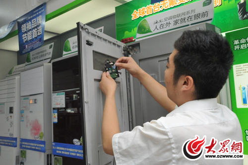 工作人員正為物聯(lián)網(wǎng)空調(diào)安裝智能“芯”—中國移動3G SIM卡