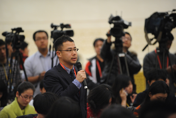 2012年3月2日15時(shí),全國(guó)政協(xié)十一屆五次會(huì)議新聞發(fā)布會(huì)在人民大會(huì)堂三樓金色大廳召開,大會(huì)新聞發(fā)言人趙啟正向中外媒體介紹本次大會(huì)有關(guān)情況,并回答記者提問(wèn)。圖為日本朝日電視臺(tái)記者提問(wèn)。陳競(jìng)超 攝