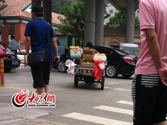 在解放路某醫院門口,看到城管到來,一位商販騎上三輪車就走。見習記者 孫翔 劉雪晴 攝