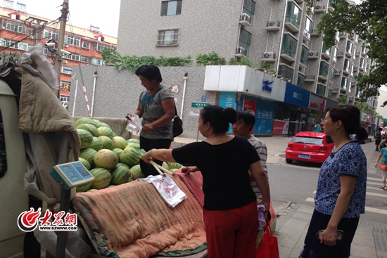 上午10:40,大眾網記者來到了棋盤東街南頭。“這是城管規定的賣瓜點,這個辦法實行3年了,俺們的生意不錯,也不收攤位錢。”瓜販許大哥告訴記者,3年前濟南“西瓜地圖”政策還沒有實行時,他們經常被城管開著車追。他的媳婦對記者說:“當時都把秤沒收了,有時候罰50,多了罰200,看什么人,脾氣好點的罰的少。”
