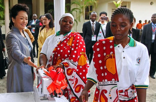 彭麗媛向坦婦女發(fā)展基金會(huì)贈(zèng)送縫紉機(jī)和書包