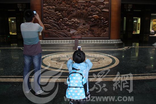 采訪團成員用鏡頭記錄著超然樓內各種有關泉城的木雕藝術品。見習記者 馬俊驥 攝