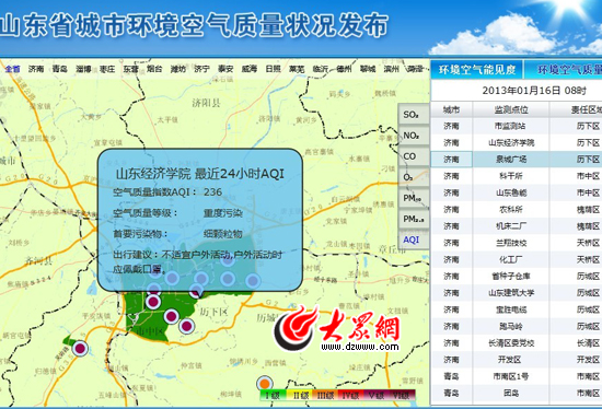 今天上午8時,濟南泉城廣場、山東經濟學院等多數環境監測點位,已由前幾天的“嚴重污染”降為“重度污染”。
