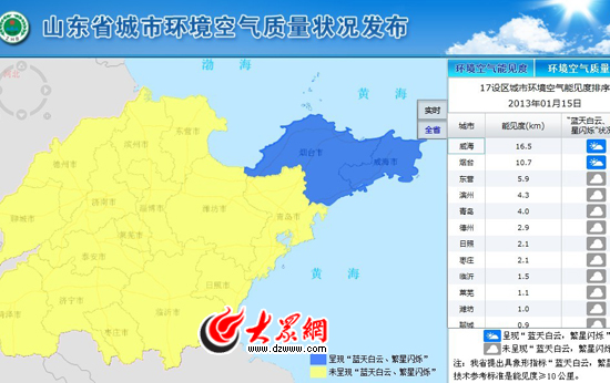 昨天,全省17地市中煙臺、威海兩市已現“藍天白云”,菏澤和濟南能見度全省最低,均為0.6千米。