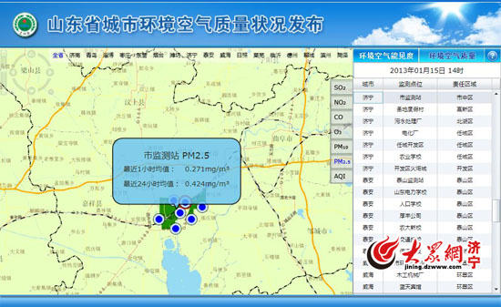市民可以登陸山東省環境保護廳網站http://www.sdein.gov.cn/,點擊“山東省城市環境空氣質量發布”http://58.56.98.78:8801/airdeploy.web/ 板塊了解濟寧市各PM2.5監測點位“最近1小時均值”和“最近24小時均值”,同時也可以查詢濟寧市“最近24小時AQI(環境空氣質量指數)” 。