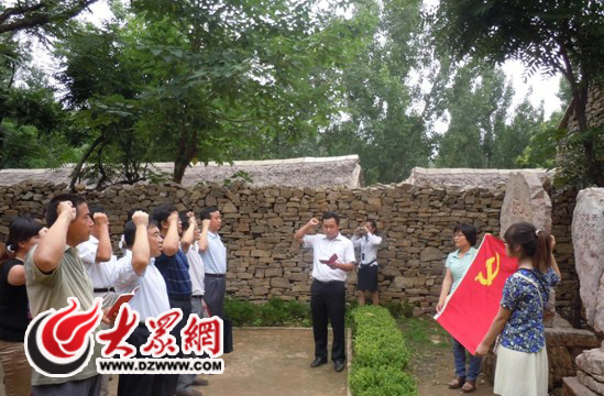 早6時,32名黨員干部集體乘車出發。途中,全體黨員認真學習了《中國共產黨章程》,精神飽滿地唱起了《沒有共產黨就沒有新中國》、《團結就是力量》等紅色歌曲。來到馬牧池教育基地后,大家不顧身體疲憊,接著就開始了參觀學習,聽著講解員飽含深情的講解,看著珍貴的歷史資料,全體黨員無不為之吸引和感動。在沂蒙紅嫂王換于的事跡報告會現場,大家都留下了激動的淚水。在著名的革命歌曲《跟著共產黨走》的誕生地,大家面對刻有這首歌譜的石碑和鮮紅的黨旗,舉起右手莊嚴宣誓并重新唱響了這首革命歌曲。