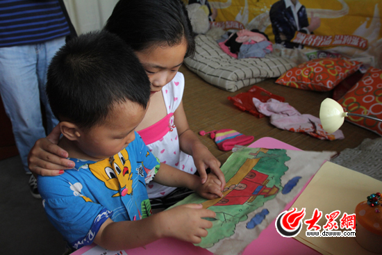 曹欣冉的弟弟曹朕赫也領(lǐng)到了“第一書記”帶來的書包和畫筆,并畫了一幅名為“我的夢想”的畫。大眾網(wǎng)記者 尹海洋攝