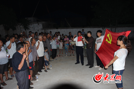 6月27日晚,一場特殊的黨員會在費縣南張莊鄉太白村的健身廣場舉行。19名黨員在“第一書記”劉兵的帶領下重溫入黨誓詞。