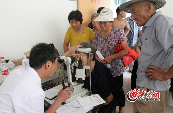 7月31日下午2點多,東阿縣魚山鎮舉衛生院里人頭攢動,來自姜韓、范坡、張坊、曹廟等行政村的200多名村民聚集在這里,等待來自省城濟南的醫生為他們免費檢查眼睛。