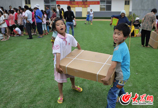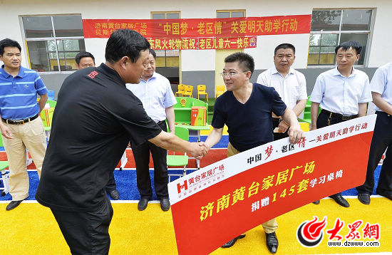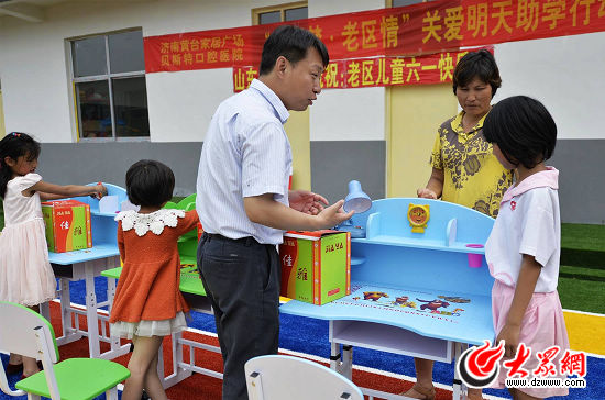 在第65個兒童節即將到來之際,為村里的孩子們送上一份精美的節日禮品成為了大眾日報駐任橋村第一書記最近一直思考的問題。他想方設法聯合濟南黃臺家具廣場、濟南貝斯特口腔醫院、濟南環球雅思學校、山東風火輪物流公司等單位,發起了“中國夢 老區情 關愛明天助學行動”,四家愛心企業捐贈了價值十余萬元的家用學習桌子和護眼臺燈,在兒童節來臨之前將禮物捐贈到了每個學生手中。