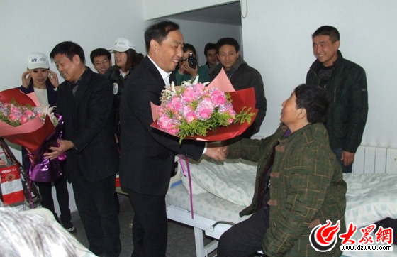 圖為浦發(fā)銀行濟(jì)南分行行長孔建為患者送上鮮花及慰問品。