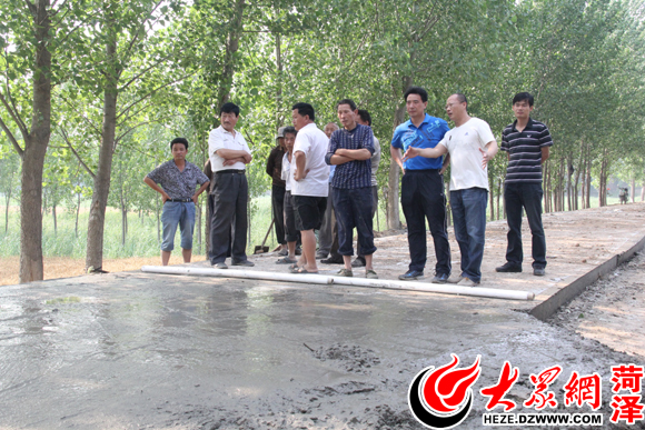 山東師大派駐東明縣菜園集鎮第一書記后衙村戰秉聚(右三)、祥寨村譚效忠(右二)、洪莊村尚延山(右一)到修路工程現場調度工作