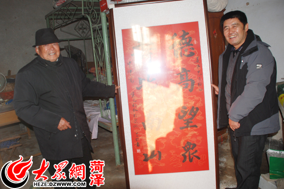 劉中坤(右)從濟南帶了一塊祝壽牌匾送給85歲的村民姜喜山