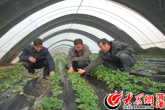 王海峰(中)在大棚里了解草莓生長情況