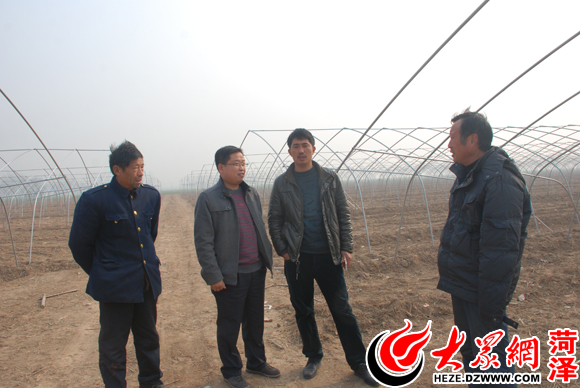 王海峰(左二)向種植戶了解170畝大棚建設情況