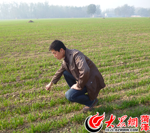 吳明磊現(xiàn)場查看麥苗長勢情況