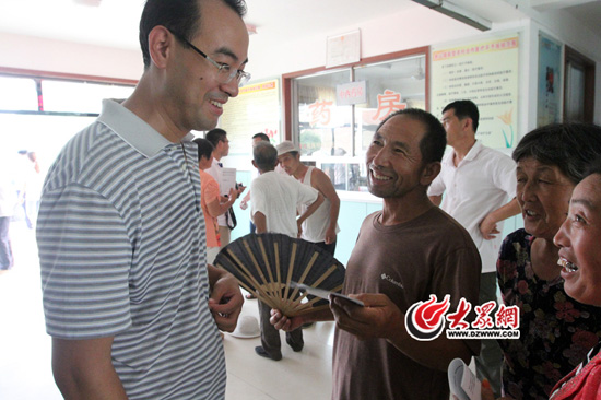 省金融辦派駐魚山鎮(zhèn)范坡村的“第一書記”賈洪斐剛出現(xiàn)在鎮(zhèn)衛(wèi)生院,就被村民包圍了。大家向他咨詢治療白內(nèi)障是否真的全部免費(fèi),得到肯定回答后,村民們才滿意地笑了。大眾網(wǎng)記者 尹海洋攝