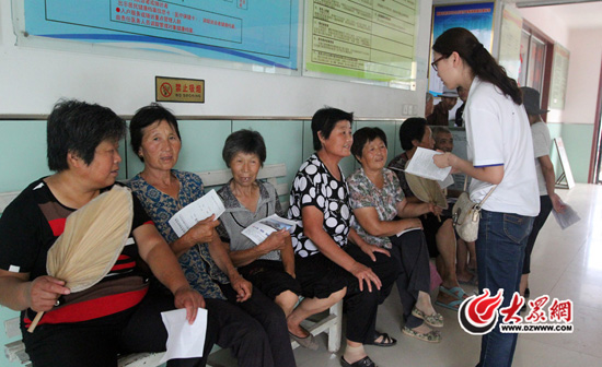 浦發(fā)銀行濟(jì)南分行的志愿者為排隊(duì)等待白內(nèi)障篩查的村民們分發(fā)病歷。大眾網(wǎng)記者 尹海洋攝
