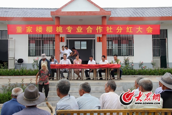 大眾網(wǎng)日照9月23日訊(記者 李佩強(qiáng) 張希嘉)“五張掉漆的木桌”、“一條劣質(zhì)的條幅”、“一群踢踏著拖鞋的農(nóng)民”、“一聲手機(jī)發(fā)出的最弦民族風(fēng)鈴聲”、“一張張嶄新的儲(chǔ)蓄存單”,這些與城市完全不同的景象,是9月22日下午記者在大耳山櫻桃專業(yè)合作社的分紅大會(huì)上看到的。這個(gè)位于山東省五蓮縣叩官鎮(zhèn)董家樓村,以櫻桃銷售為主的合作社,在2013年經(jīng)歷了一場(chǎng)暴風(fēng)雨對(duì)櫻桃的洗劫。盡管如此,村民臉上并沒(méi)有透露出一絲愁悶,因?yàn)闄烟胰匀毁u得相當(dāng)好,這要?dú)w功于“第一書記”袁志華對(duì)櫻桃電子商務(wù)化的推動(dòng)。