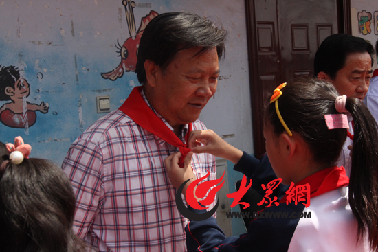 東平縣戴廟鎮中心小學的小學生為省人大辦公廳副主任高月塘系紅領巾。