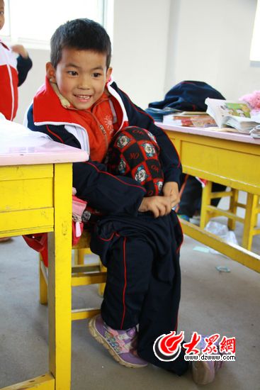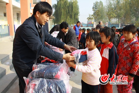 來自山東食品醫藥監督管理局的五位“第一書記”把分別校服交到孩子們手里,每一名孩子都抱著校服高興帝跑進教室,還沒坐穩就迫不及待地打開包裝試了起來。