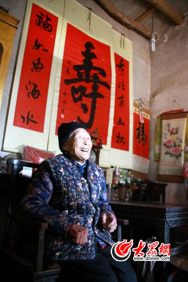 在楊素貞的堂屋墻上,還掛著一幅毛筆書寫的“壽”字,和一幅壽聯,這是郭鋒親自寫好裝裱并給楊素貞掛在墻上的。記者 張帆 攝