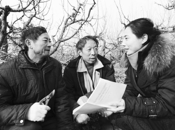 2012年12月12日,棗莊市山亭團區委派駐店子鎮苑莊村“第一書記”高曉娟(右)在果園向農民宣傳十八大精神。10多年了,黃溝村一直沒有黨員納新對象,村支部不健全,黨員活動一年搞不了一次,一直是鎮里的三類落后班子。