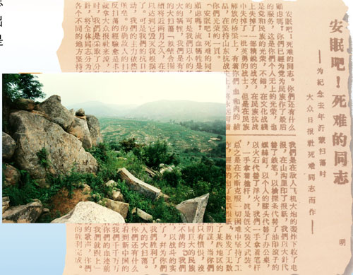 1941年冬,大眾日報第一戰時新聞小組30多位同志不幸陷入敵人的合擊圈內,除個別同志突圍,其余全部壯烈犧牲。圖為當年烈士戰斗和犧牲地——沂南縣(今費縣境內)大青山和悼念烈士的版面