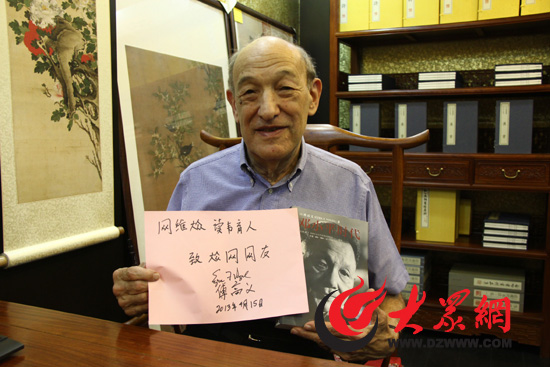 盡管在中國居住的時間并不長,但82歲高齡的傅高義講得一口流利的中文,并對漢字有所研究。當大眾網記者邀請他為廣大網友留言時,他笑著點頭答應。思索片刻后,他用黑色簽字筆寫下“網維大眾,讀書育人”八個字。