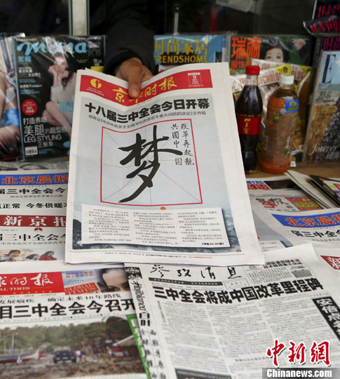 11月9日,北京一個報攤上,多家報紙的頭版都報道了十八屆三中全會當天開幕這一消息。中新社發 李慧思 攝