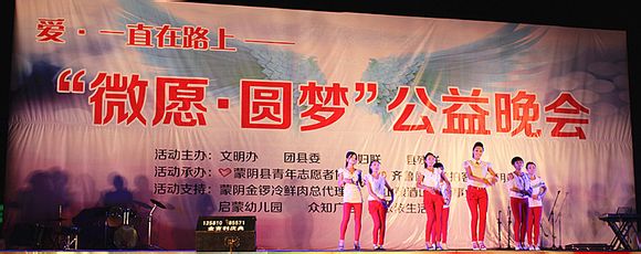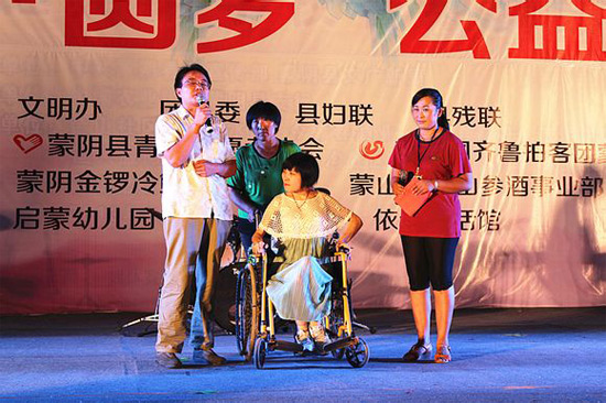 8月21日晚,蒙陰縣在城北廣場舉行了愛一直在路上--“微愿·圓夢”公益晚會,對項目開展一個月以來的情況進行了匯報演出。晚會現場,催人淚下的現場捐助與精彩紛呈的文藝演出交叉進行。共有12名尋夢者分別接受了圓夢者們給他們現場提供的資金、衣服、筆記本電腦以及旅行箱等愛心物資,捐助物資共計人民幣4萬元。