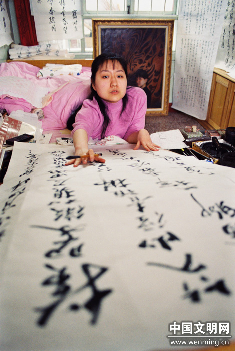 以殘疾之身創(chuàng)造生活奇跡的山東姑娘劉曉清被網(wǎng)友稱為“最美輪椅姐姐”、“最美輪椅姑娘”、“濰坊張海迪”。這是劉曉清10年以前的照片。19年來,曉清就是這樣趴在床上寫字作畫。(魯少河老師攝于2001年5月,劉曉清的家中)