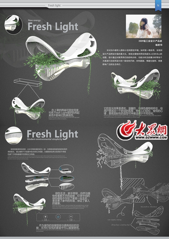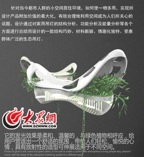 針對當(dāng)今都市人群的小空間居住環(huán)境,如何使一物多用,實現(xiàn)所設(shè)計產(chǎn)品附加價值的最大化,有效合理地利用空間成為人們所關(guān)心的話題。將科技運用到設(shè)計中,實現(xiàn)節(jié)能、環(huán)保,并進(jìn)一步提升人們的生活品質(zhì)。設(shè)計通過對家用吊燈的結(jié)構(gòu)分析、功能分析、材料分析,對綠色植物的生長環(huán)境分析、水分解分析及能量分析等各個方面進(jìn)行總結(jié)而設(shè)計的一款結(jié)構(gòu)巧妙、材料新穎、情趣化獨特、受惠群體廣泛的生態(tài)吊燈。
