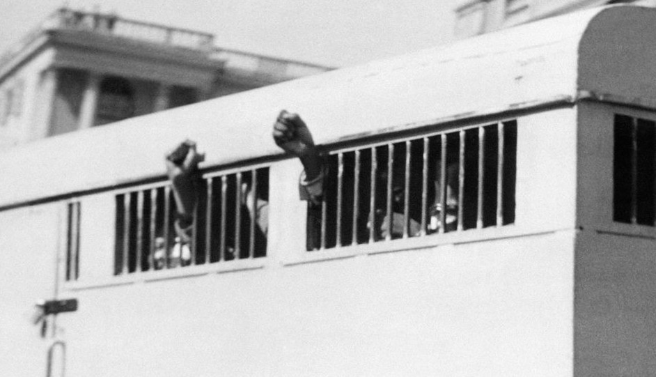 1961年6月曼德拉創(chuàng)建非國大軍事組織“民族之矛”,任總司令。1962年8月,曼德拉被捕入獄,南非政府以“煽動”罪和“非法越境”罪判處他5年監(jiān)禁。1964年6月,曼德拉又被指控犯有“企圖以暴力推翻政府”,改判為無期徒刑。圖為包括曼德拉在內(nèi)的8人在1964年6月16日離開比勒陀利亞的司法大樓時(shí)從鐵窗內(nèi)伸出拳頭。