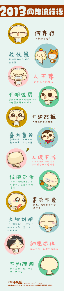 臨近年底,各種盤點、榜單等都紛紛出爐。近日,一份新鮮出爐的“2013年十大網絡流行語”榜單在網上發布,引發了網友們的強烈共鳴和討論,“土豪,我們做朋友吧”、“我和我的小伙伴們都驚呆了”、“感覺不會再愛了。”等十條網友們耳熟能詳的流行語紛紛入圍。但也有網友感嘆“十大”太少,“爸爸去哪兒”等下半年出現的流行語都沒有。