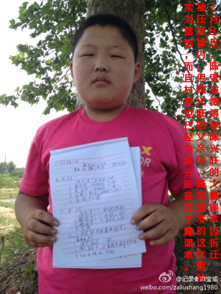 7月8日,陳寶成微博稱陳興旺的大量課本因拆遷被壓廢墟內,但陳興旺的父親說,陳寶成發的這張照片實為擺拍,而且村委也已經為陳興旺備好了新課本。
