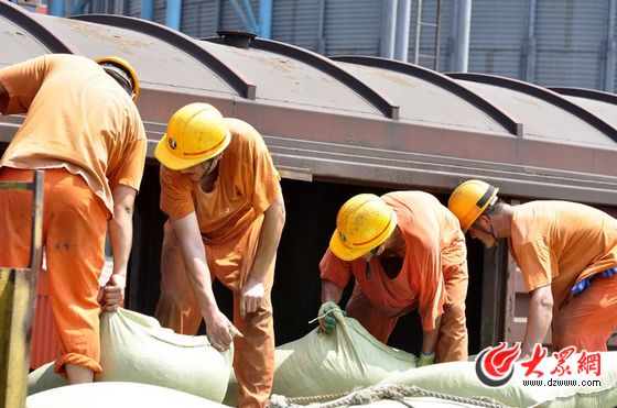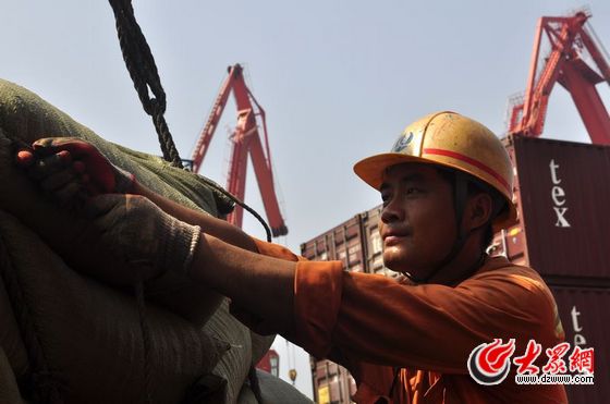 大港碼頭上,工人正在固定麻袋 王琨 攝