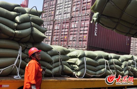 大港碼頭上,工人正在固定麻袋 王琨 攝