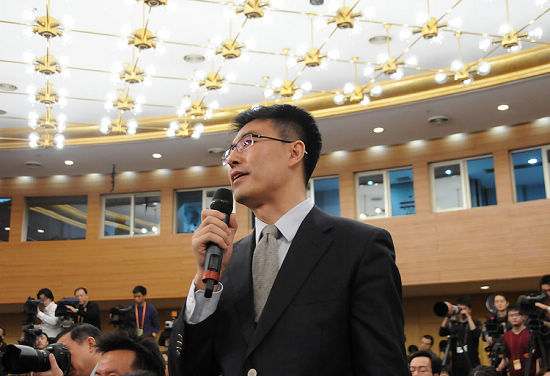 3月6日,十二屆全國人大一次會議新聞中心在梅地亞舉行記者會,國家發(fā)展和改革委員會主任張平就“經(jīng)濟(jì)社會發(fā)展與宏觀調(diào)控”的相關(guān)問題回答中外記者的提問。圖為中央電視臺記者提問。新華網(wǎng)/中國政府網(wǎng) 翟子赫 攝
